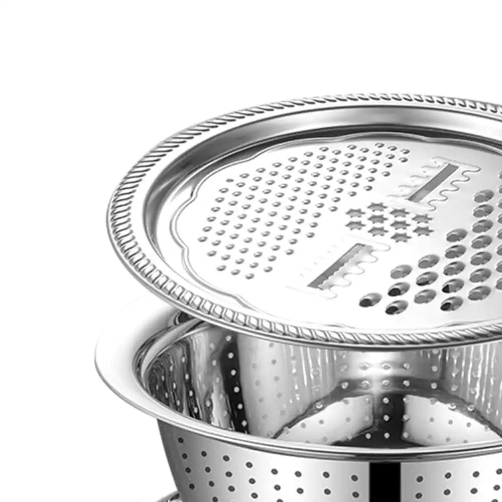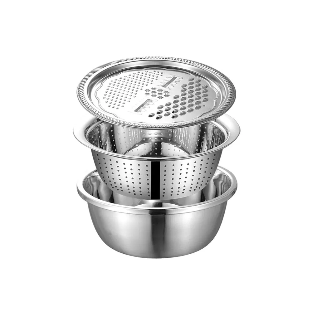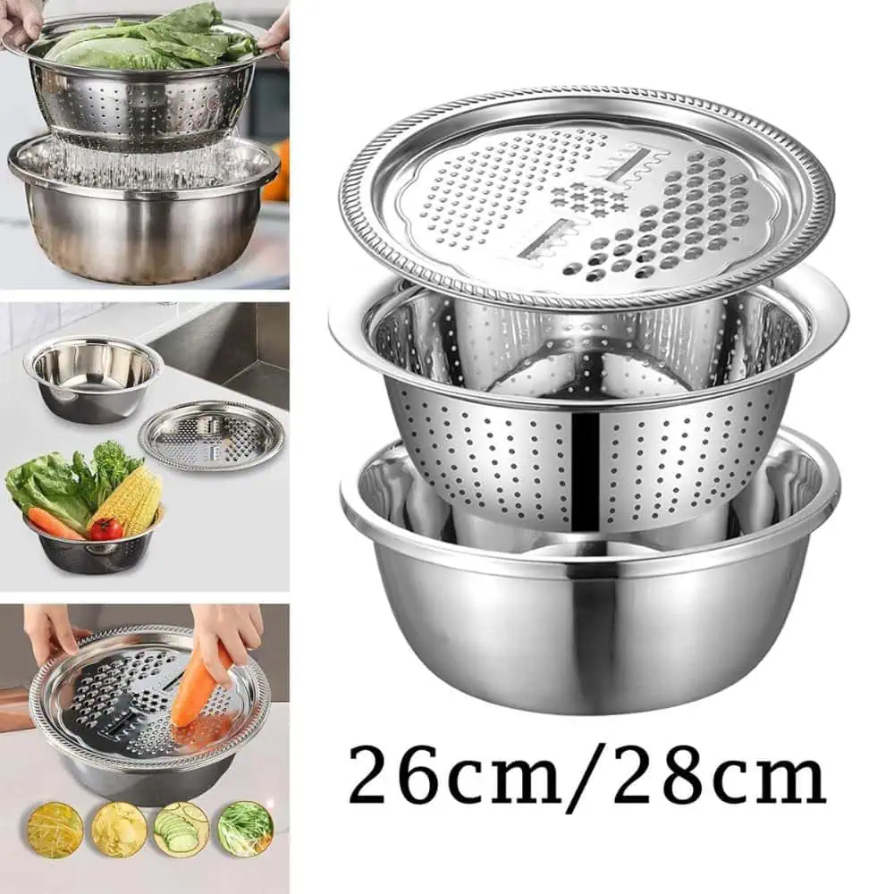 Upgrade your kitchen with the 3 in 1 Multifunctional Steel Grating Basin, an innovative tool that combines convenience, durability, and efficiency. This smart design includes a premium steel basin paired with interchangeable grater lids and a strainer, allowing you to wash vegetables, grate cheese or carrots, and mix ingredients all in one. The rust-resistant stainless steel body ensures strength and longevity, while the detachable grater makes cleaning effortless. Ideal for preparing salads, fruits, or everyday cooking, this multifunctional bowl saves time, reduces clutter, and enhances your kitchen workflow. Its non-slip base ensures stability during use, and the sleek design adds a modern touch to your kitchen essentials. Perfect for home chefs and busy households, the 3 in 1 Stainless Steel Grating Basin is a must-have for quick, organized, and healthy meal preparation.