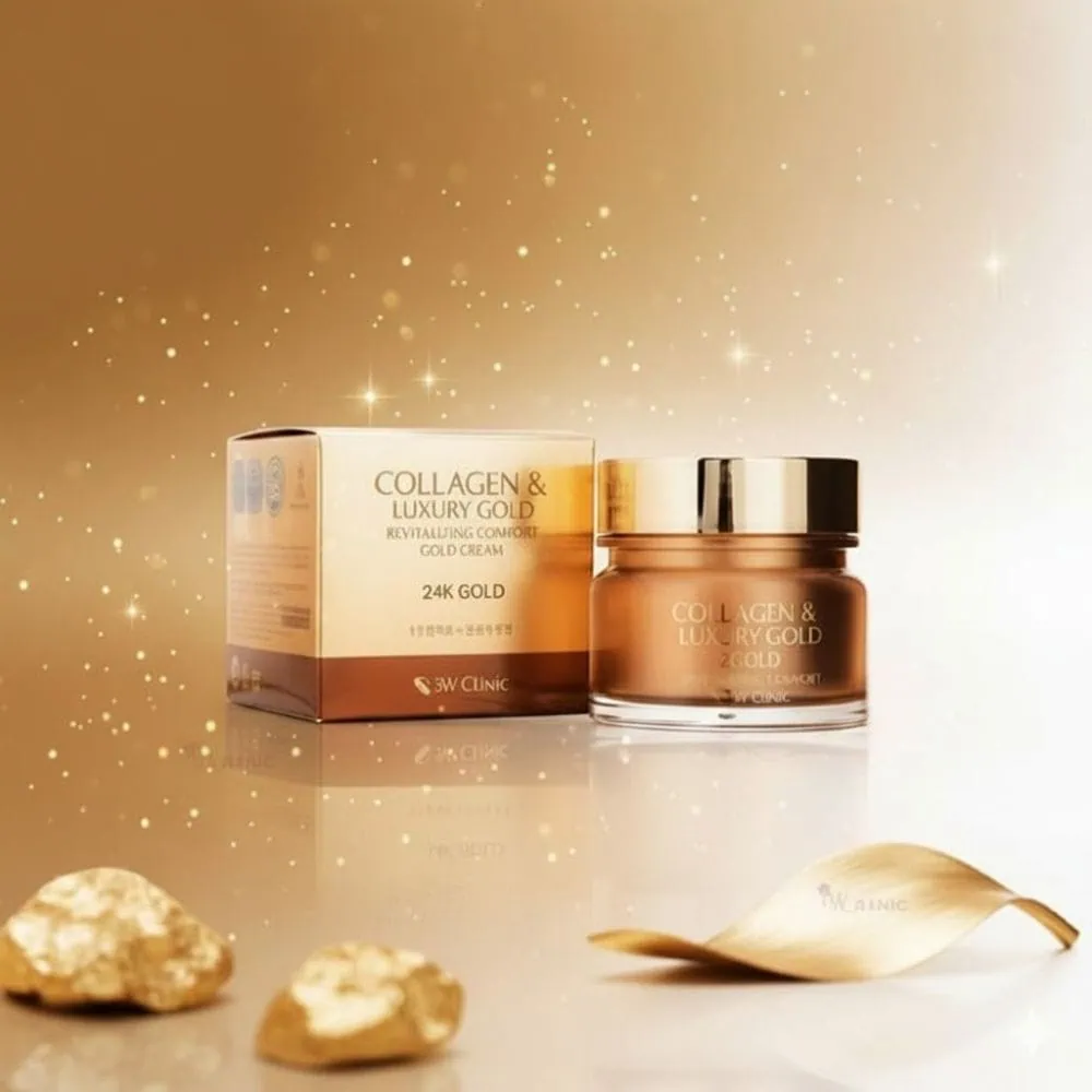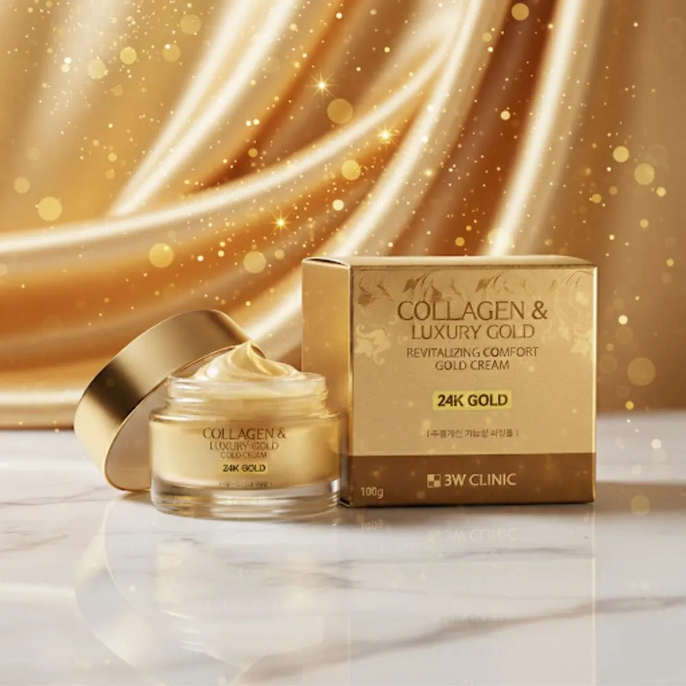 The 3W CLINIC Collagen & Luxury Gold Revitalizing Comfort 24k Gold Cream (100g) is a premium anti-aging moisturizer enriched with collagen and 24k gold to deeply hydrate, firm, and brighten skin. It reduces wrinkles, boosts elasticity, and restores a youthful glow.
