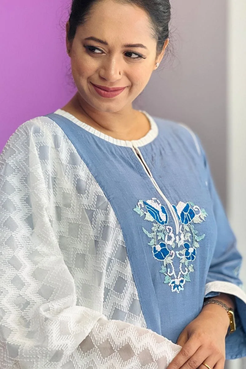 The soothing allure shade enhances its premium appeal, while the hand-embroidered detailing adds a touch of artisanal charm that sets it apart from ordinary wear. Its beautifully tailored silhouette ensures a polished look, making it perfect for office wear, casual outings, family gatherings, and semi-traditional events.