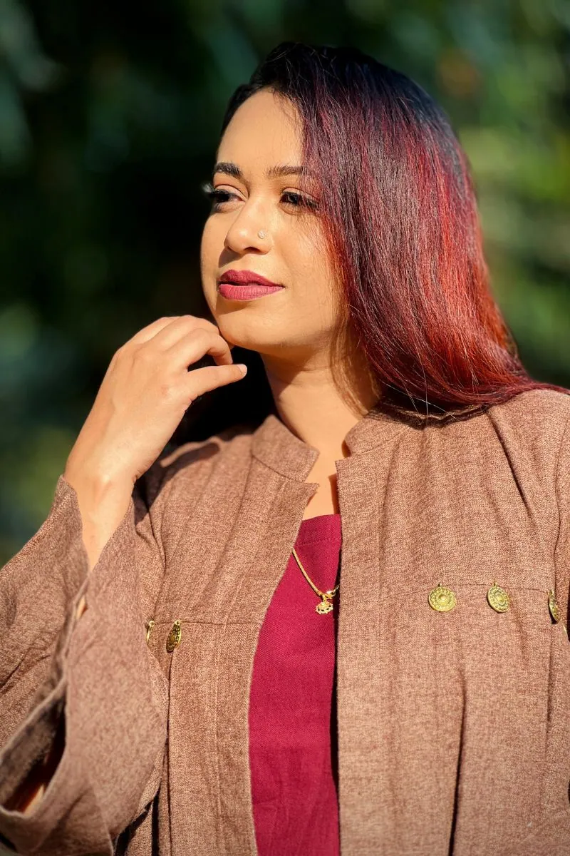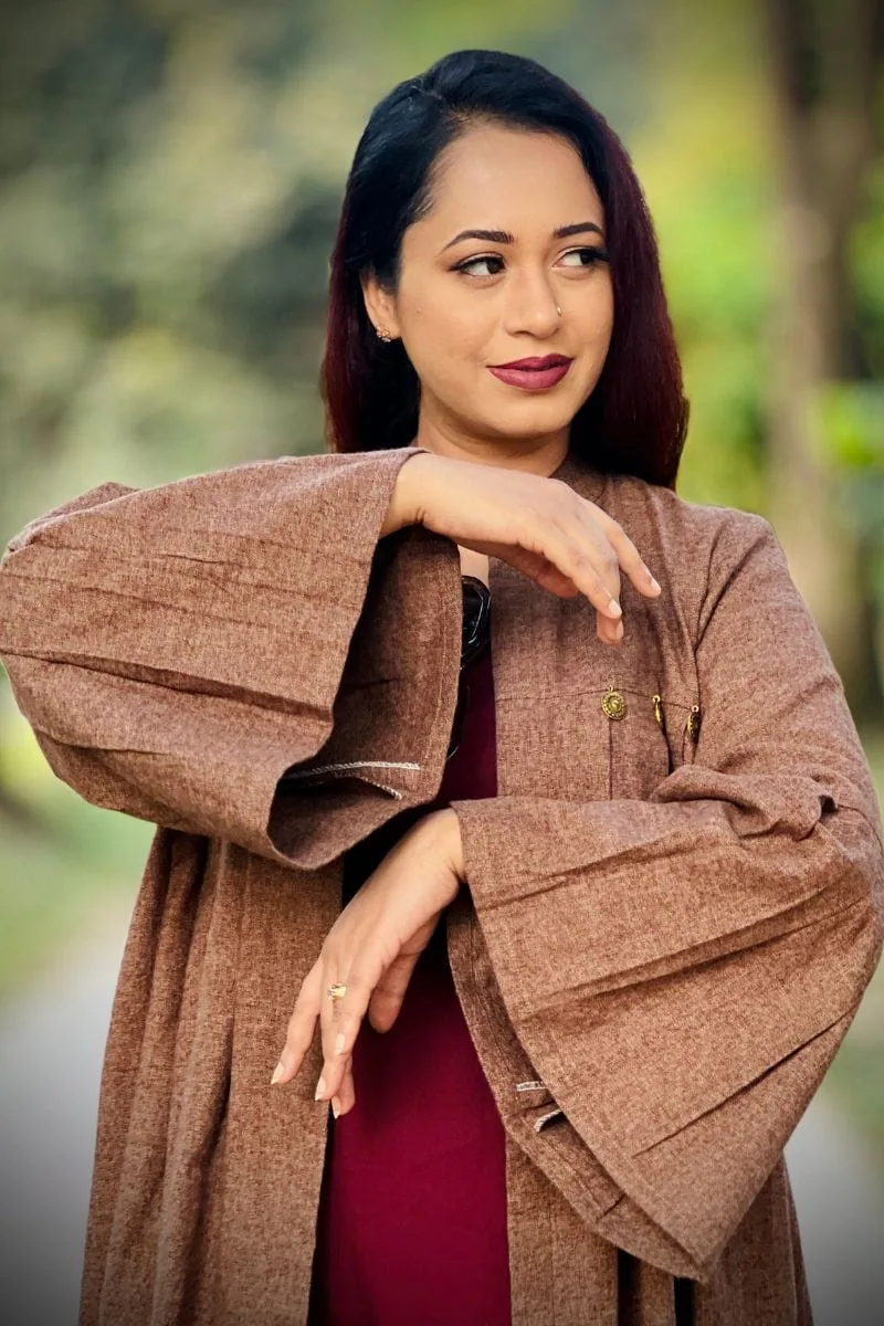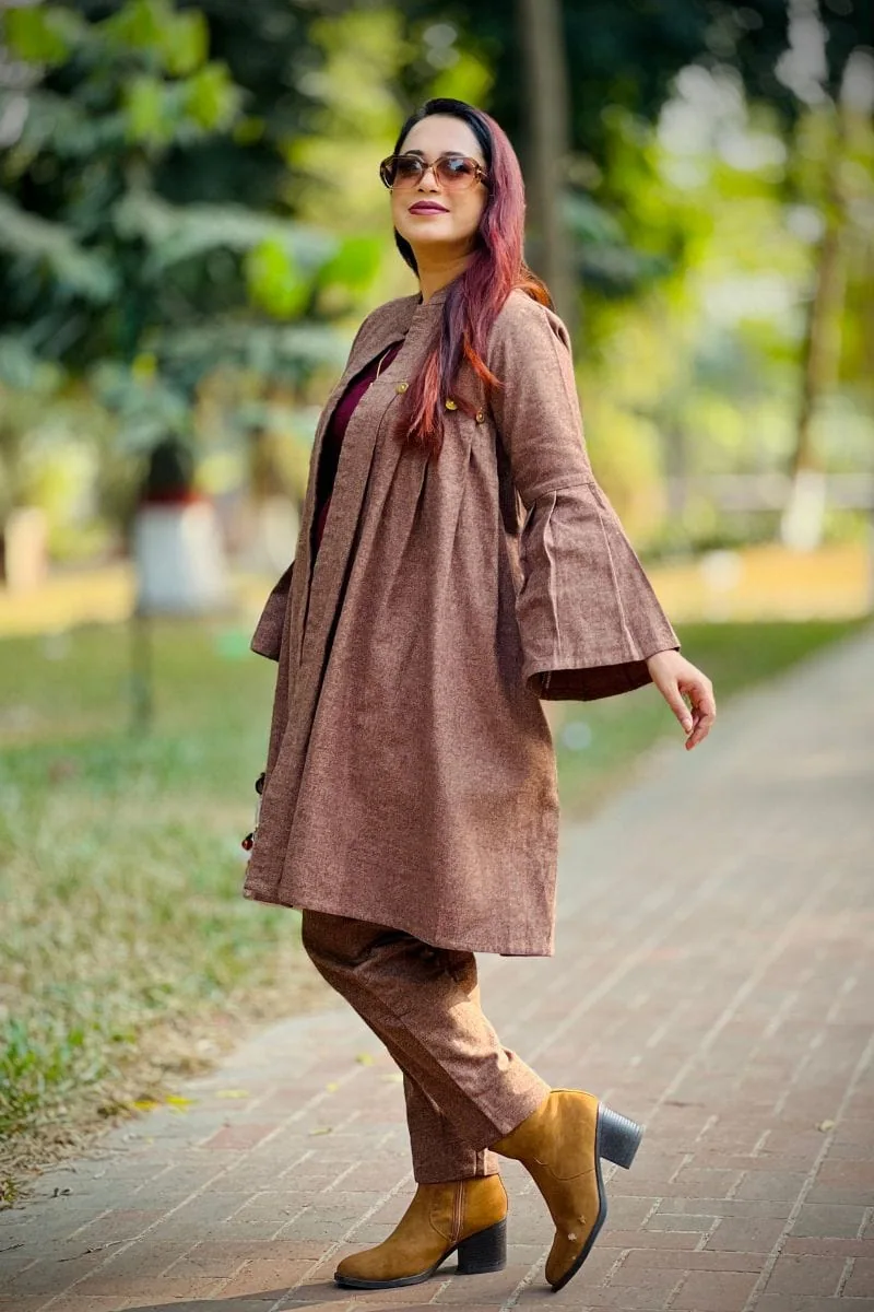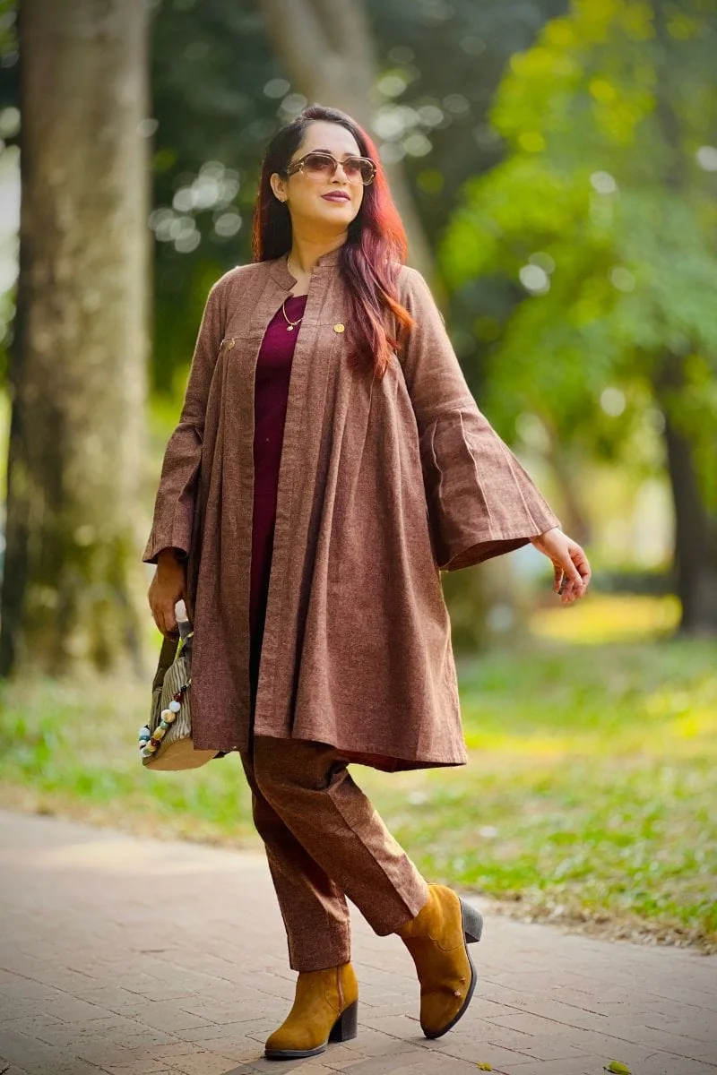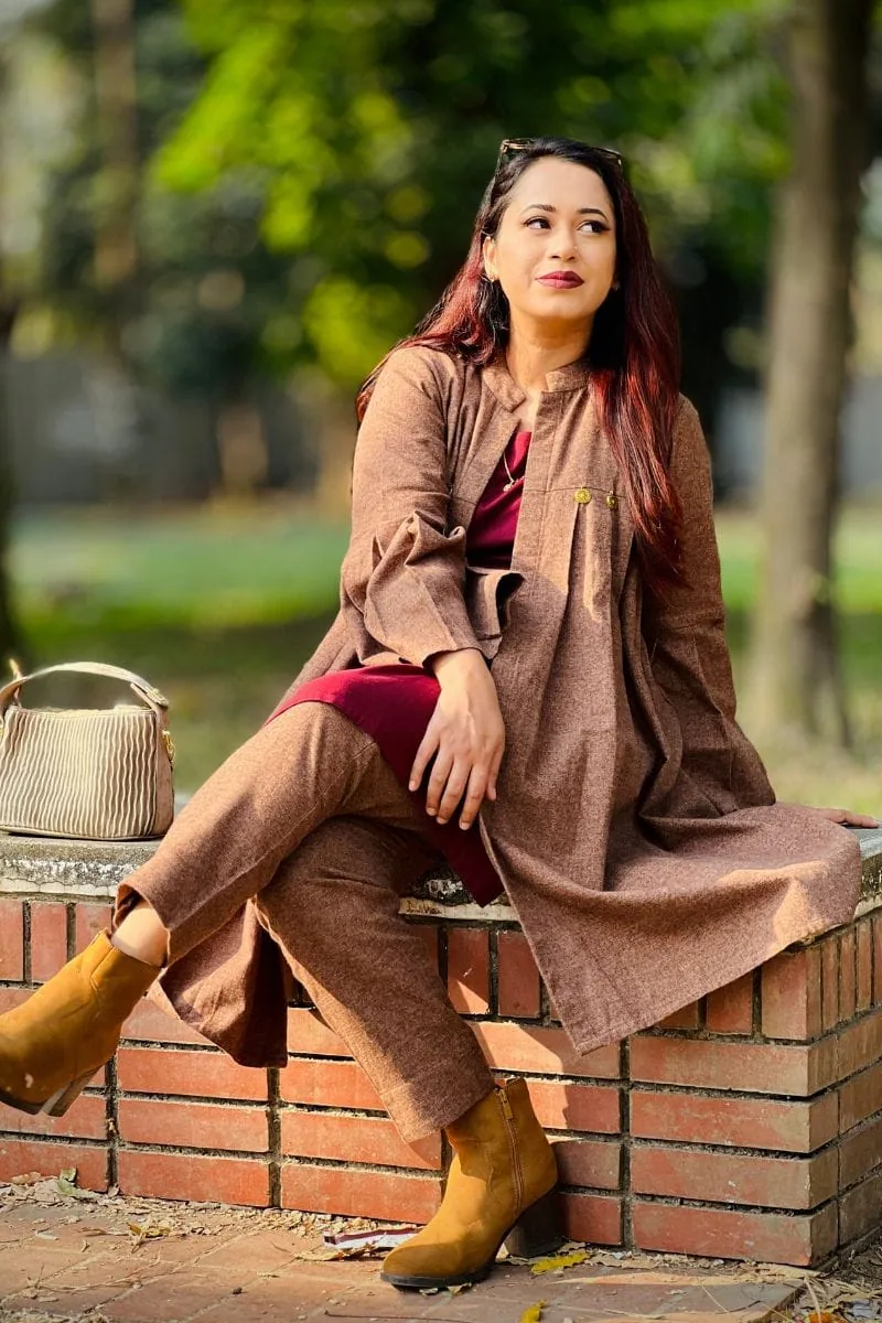The rich brown and wine red color combination creates a bold yet classy contrast, making it ideal for winter outings, casual gatherings, office wear, and travel. The coordinated inner outfit paired with a stylish shrug creates a layered look that’s both trendy and practical.