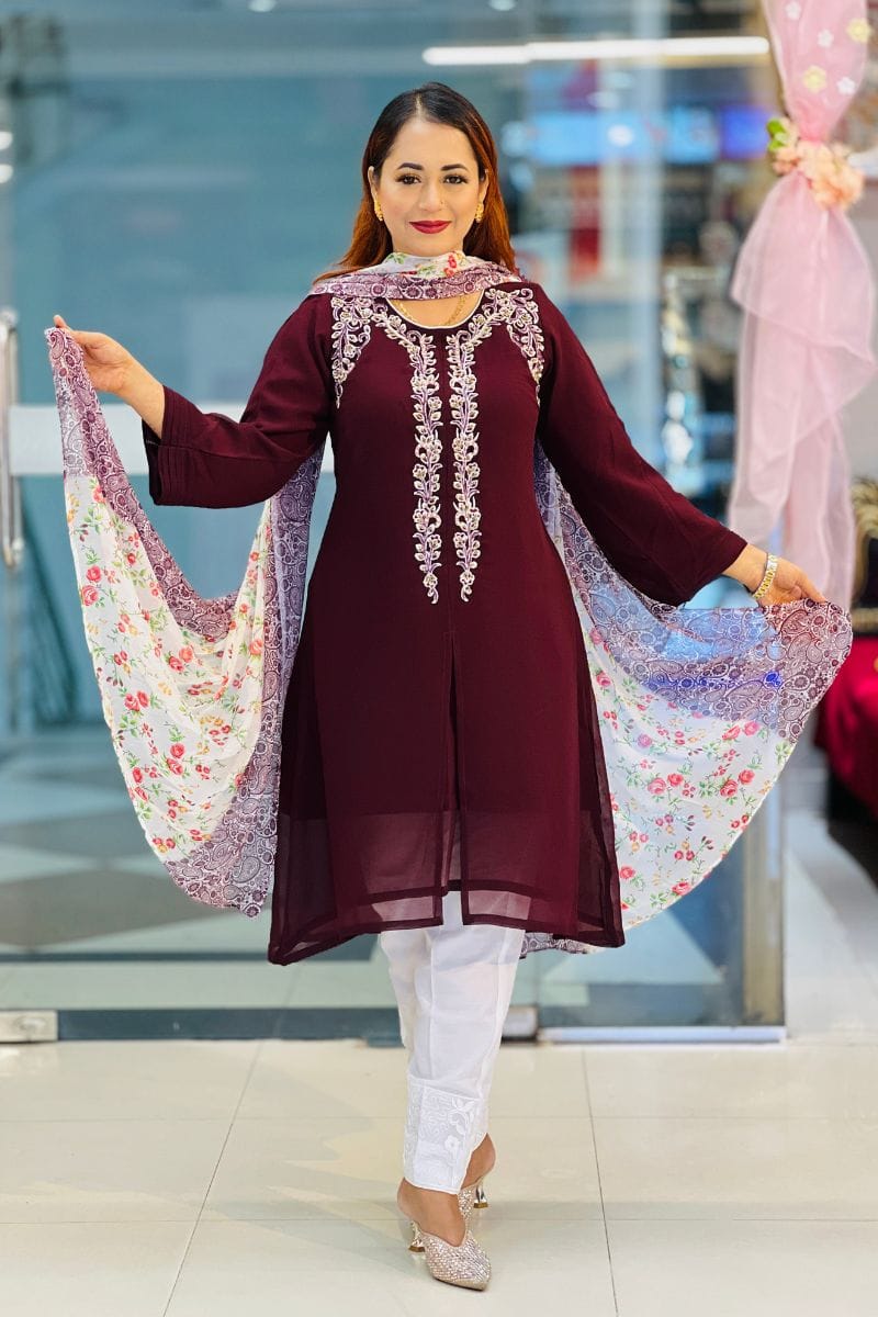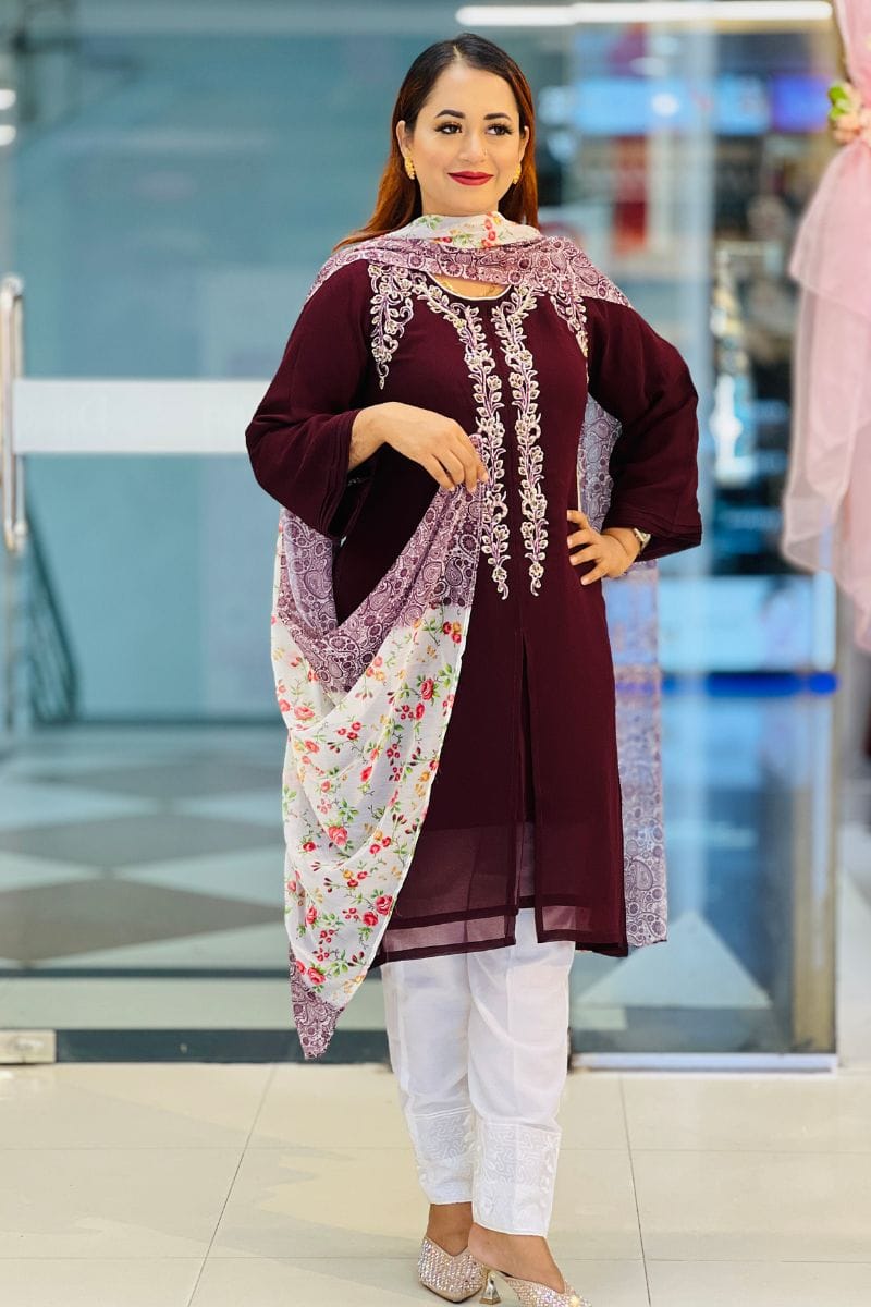 Value Addition: Machine embroidery with pearl work and digital print on dupatta.