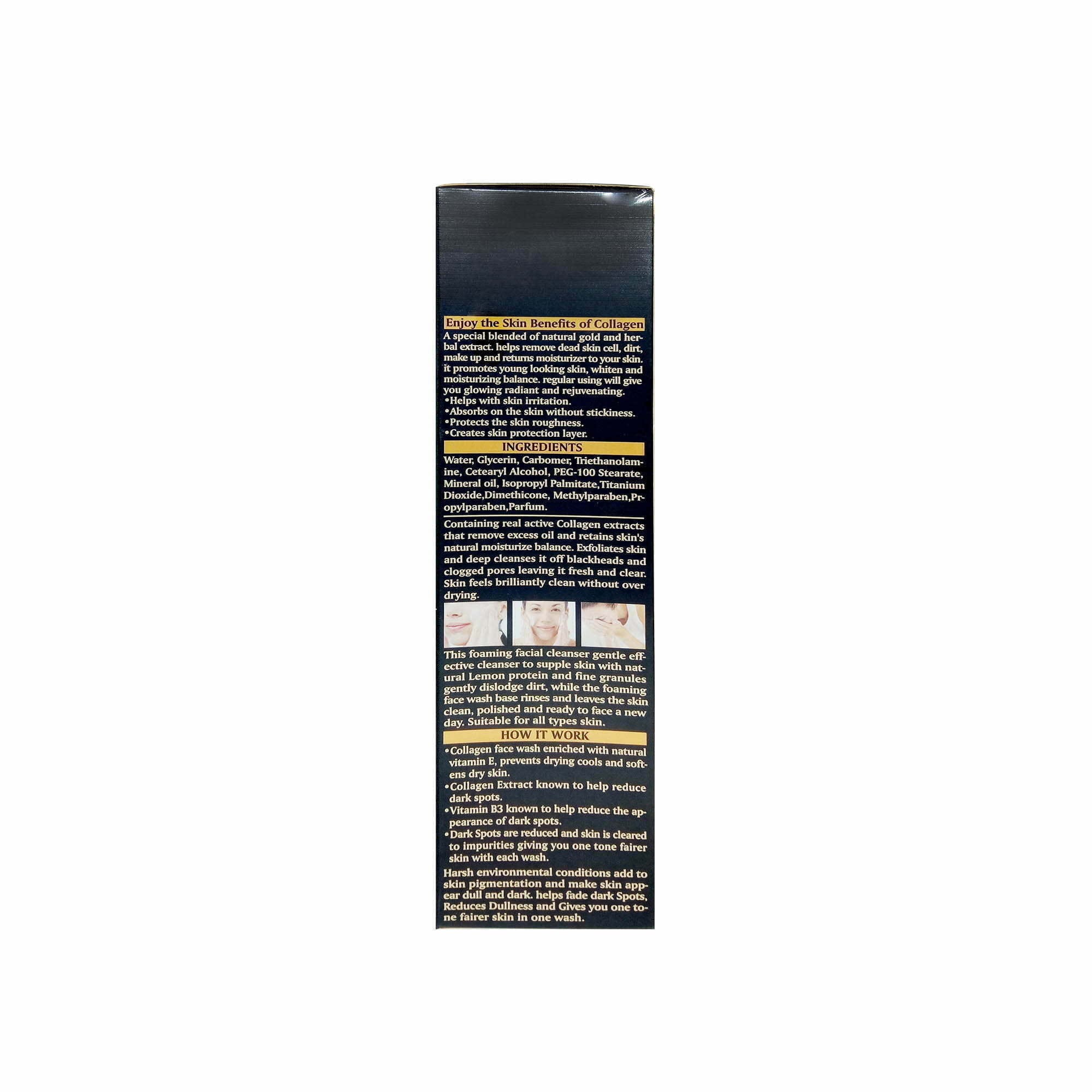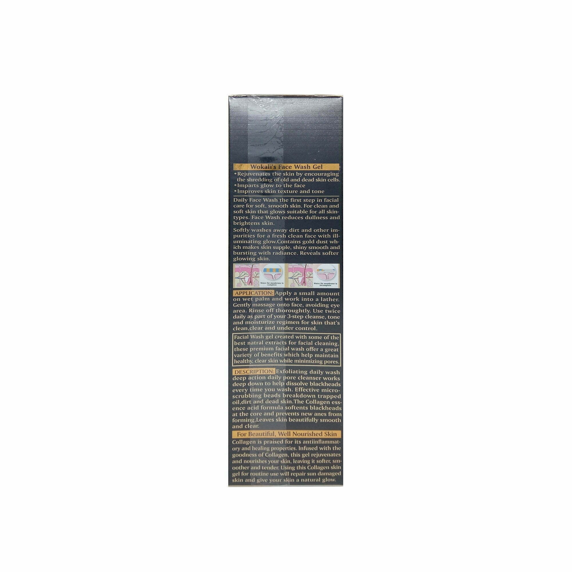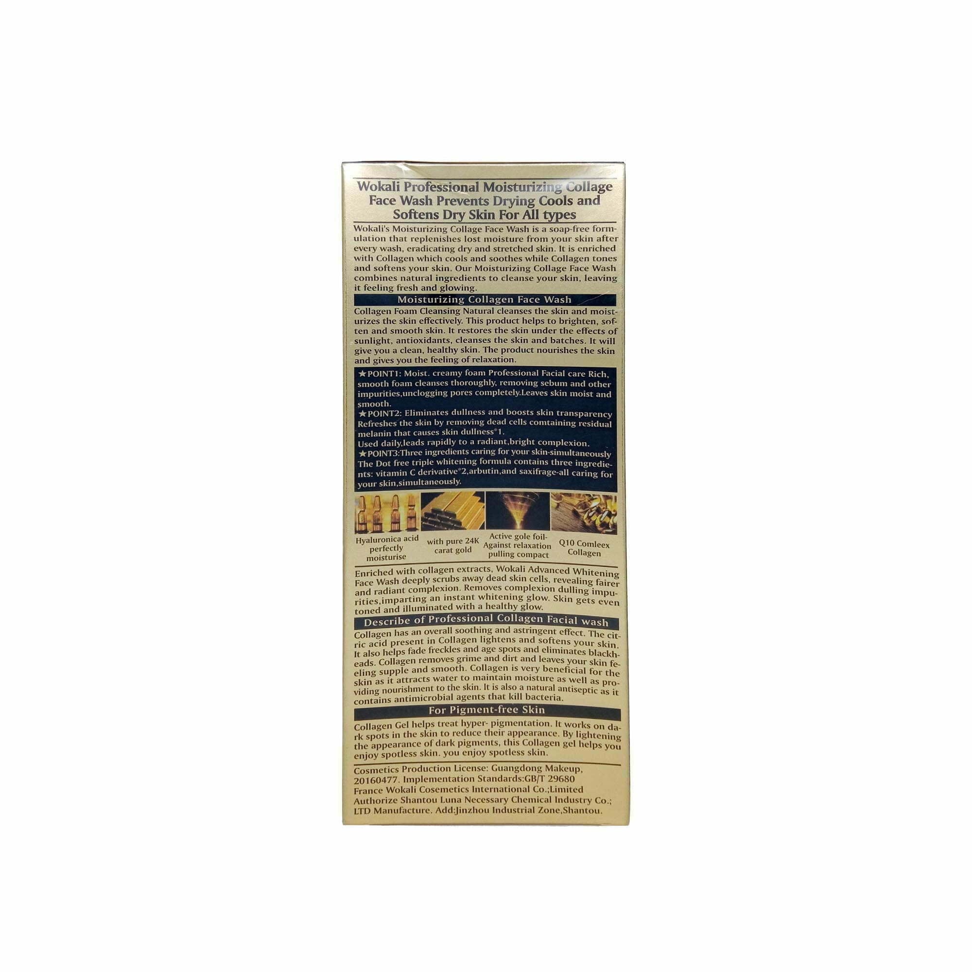 Wokali Collagen Facial Wash A special blend of natural gold and herbal extract. helps remove dead skin cells, dirt, makeup and returns moisturizer to your skin. it promotes young-looking skin, whiten and moisturizing balance. regular use will give you glowing radiant and rejuvenating.