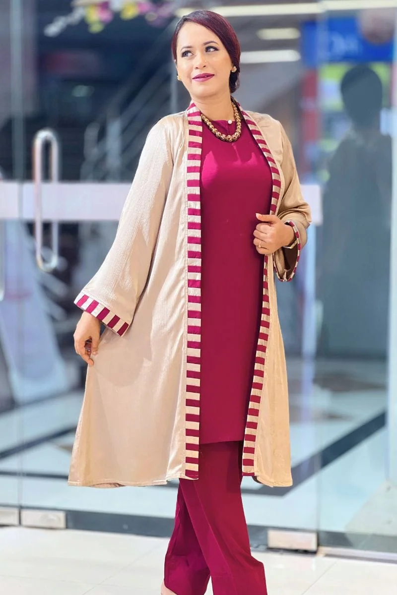 Elevate your festive style with this Golden & Maroon Georgette Shrug Set, featuring a lightweight flowy shrug and a beautifully coordinated inner set for a graceful, modern ethnic look.