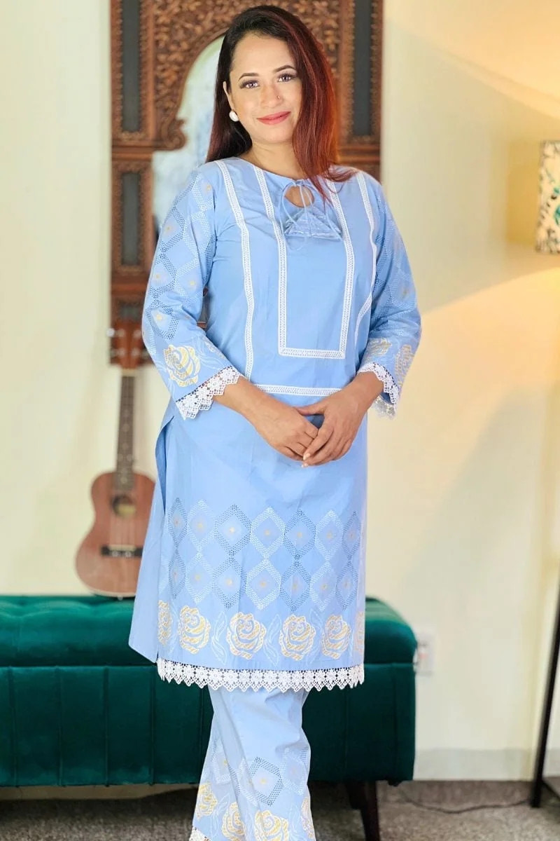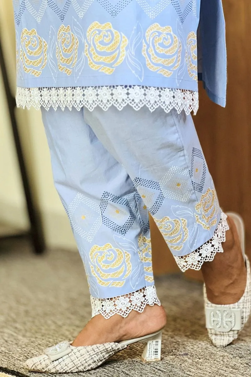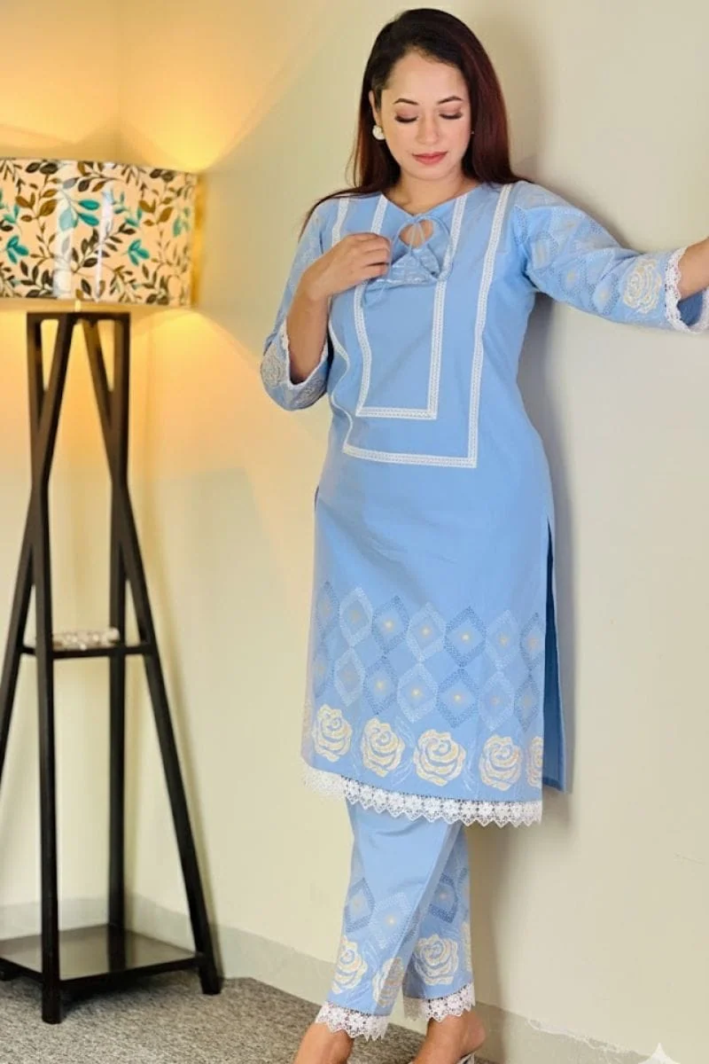 The soothing light sky blue shade brings a fresh and youthful vibe, while the screen-printed detailing adds a hint of modern artistry that enhances the overall look. The perfectly coordinated top and bottom create a polished silhouette, making the outfit suitable for brunch outings, office days, casual hangouts, and travel.