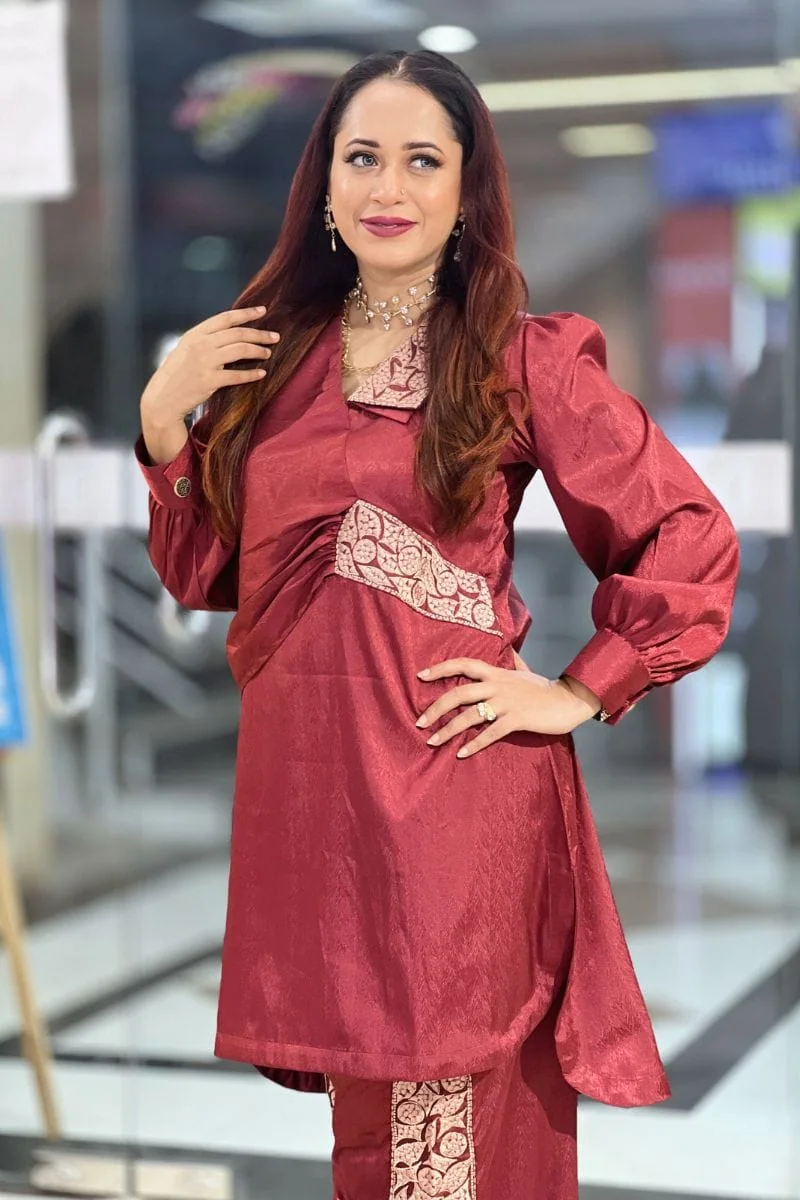 Turn heads with this Maroon Arabian Silk Machine Embroidered Co-Ords, featuring luxurious silk fabric, elegant embroidery, and a perfectly coordinated silhouette. Ideal for festive events, evening outings, and chic everyday styling.