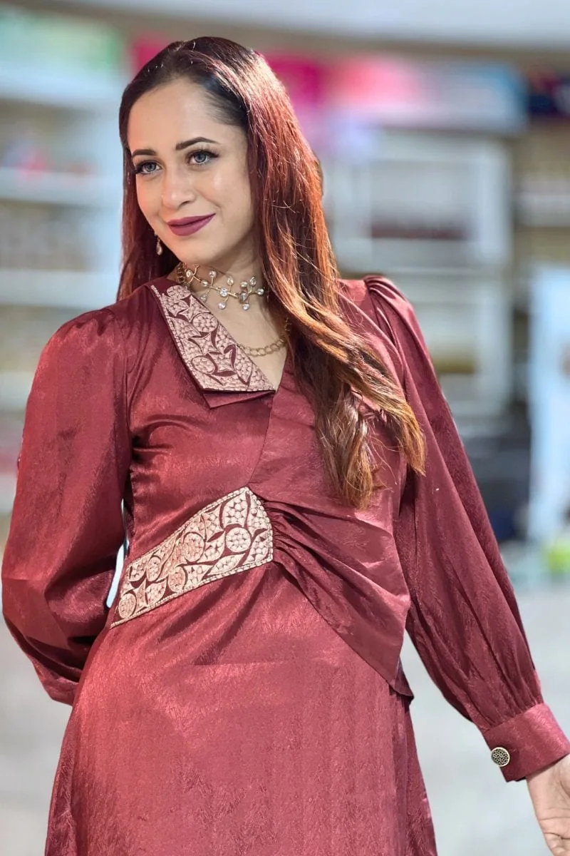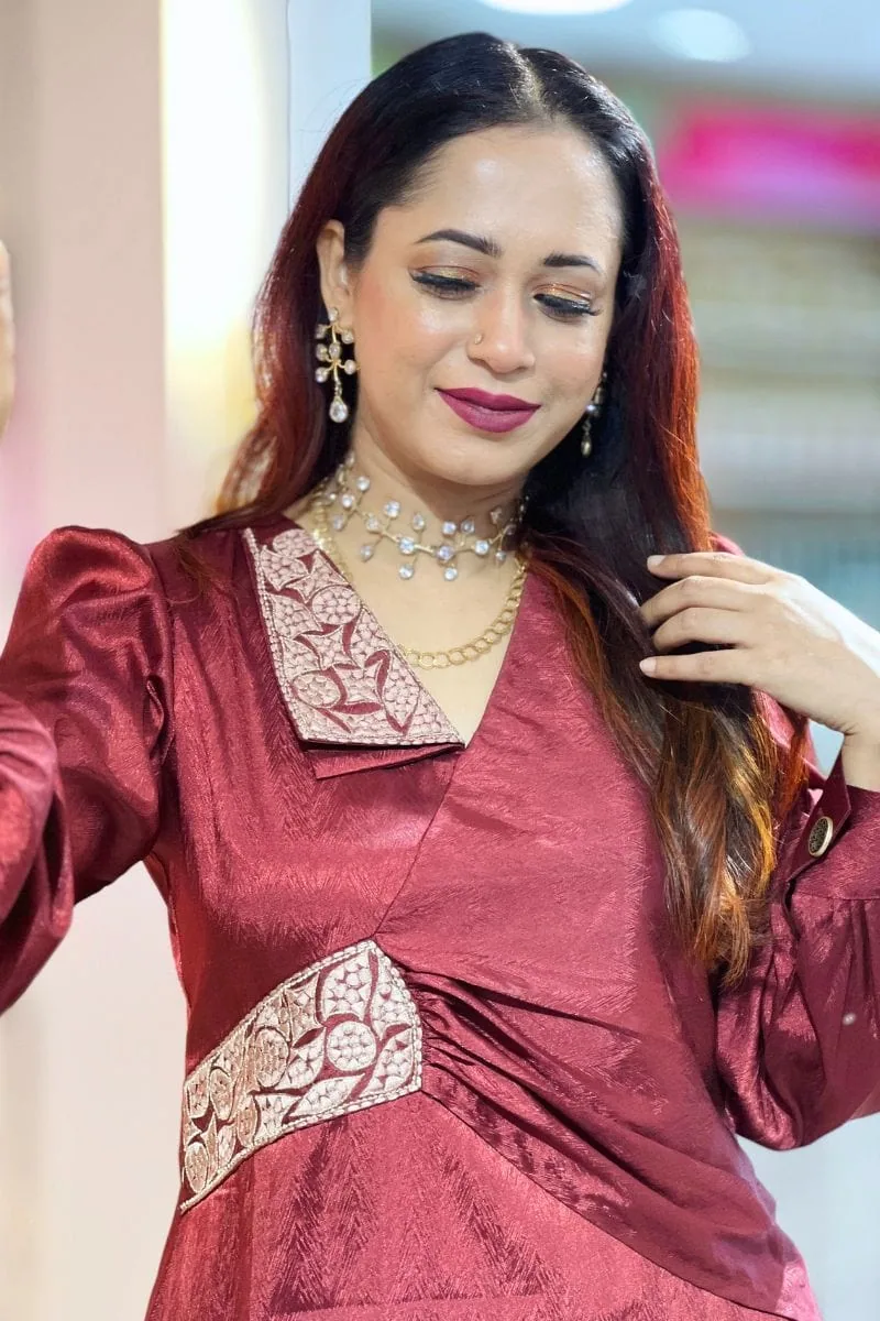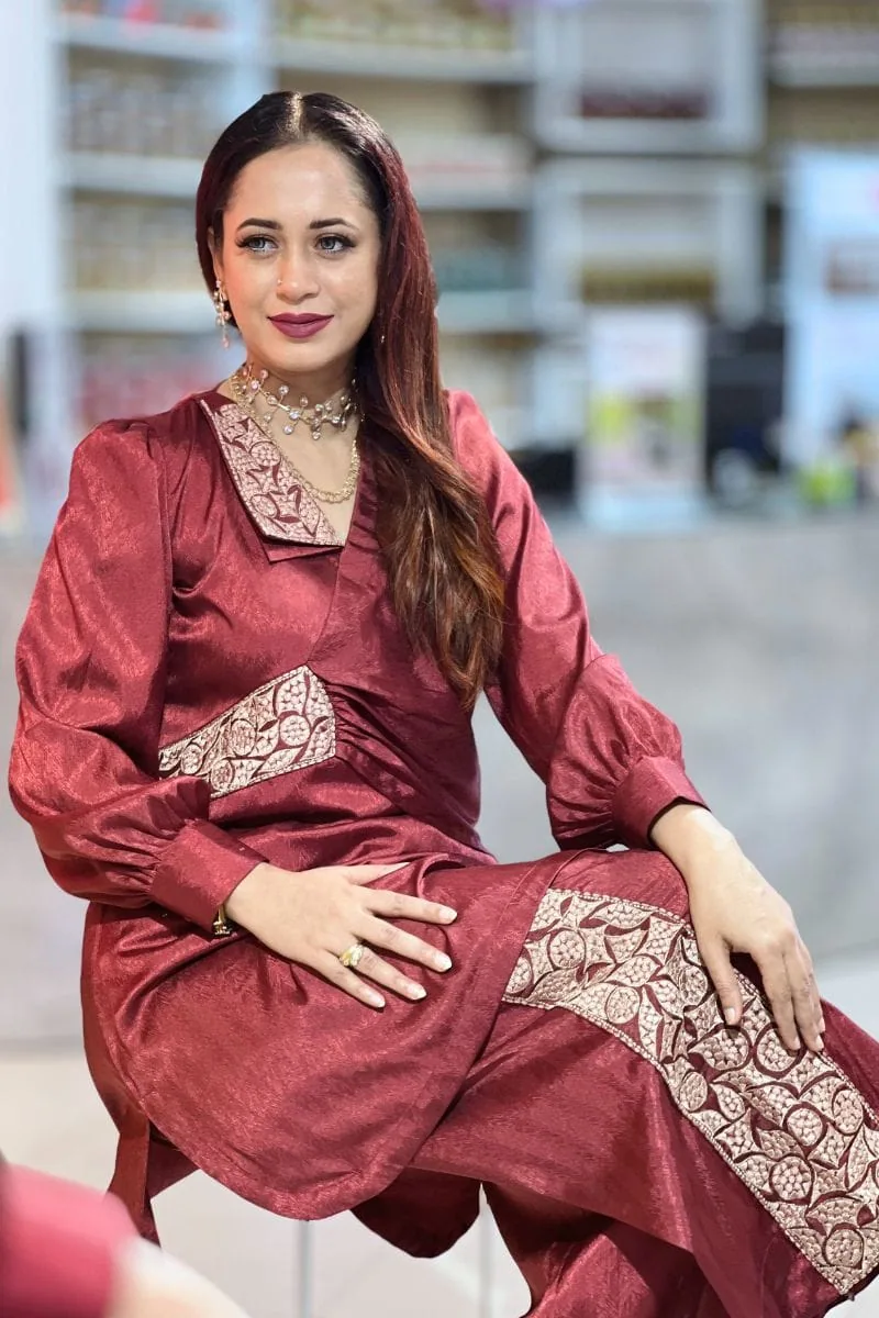 The rich maroon shade adds depth and luxury, making it perfect for festive occasions, cultural celebrations, parties, or stylish evening wear. Intricate machine embroidery enhances the outfit with a refined artistic touch, adding texture and visual appeal without compromising comfort.