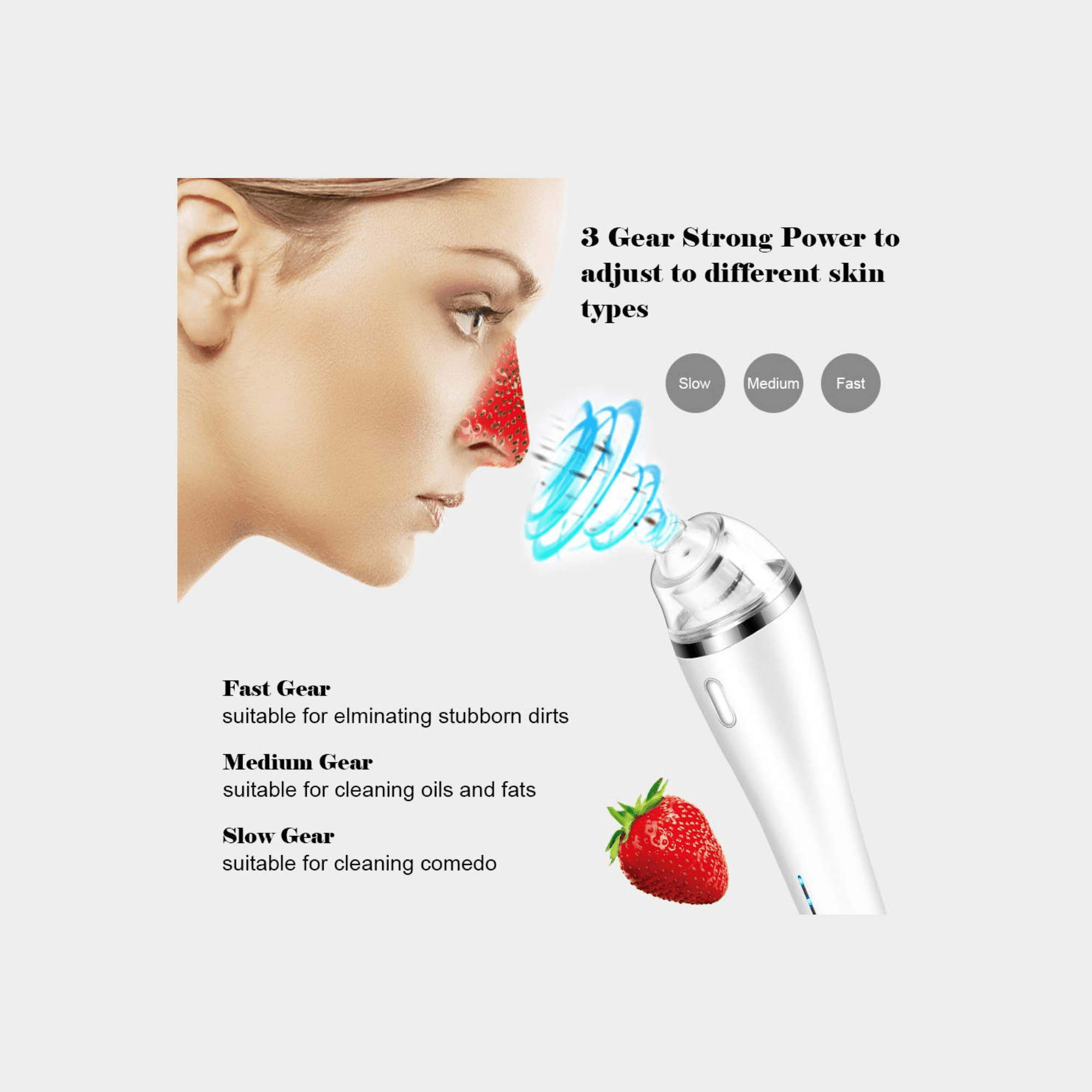 This product adopts the “vacuum suction firming skin thin face”, the working principle of its unique vacuum system, to gently lift and massage the skin, promote blood and lymph circulation, bringing skin more compact luster.
