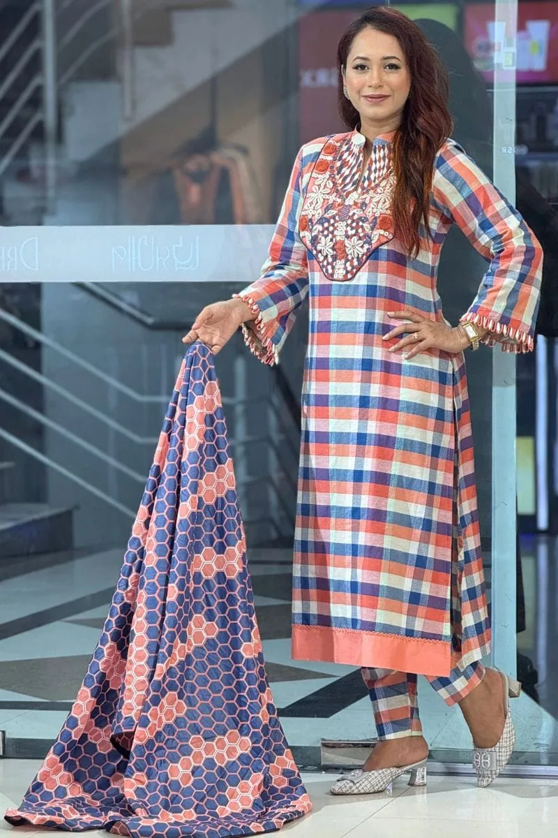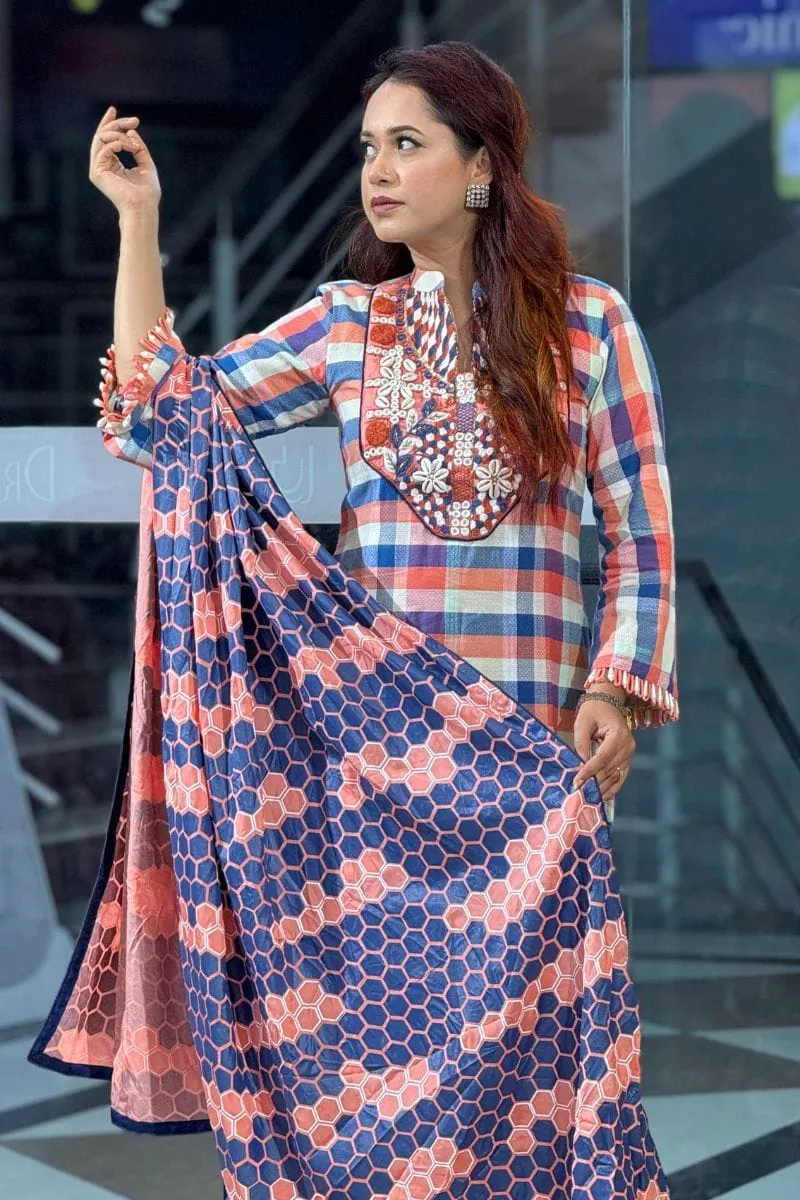 Celebrate timeless craftsmanship with the Multi Colour Cotton Hand Embroidered Shalwar Suit, designed for women who appreciate traditional elegance and modern comfort. Made from premium-quality cotton, this suit ensures breathability and all-day ease, making it ideal for spring and summer seasons. The beautifully detailed hand embroidery in multiple colors adds a unique artisanal touch, creating a vibrant yet graceful look. Its classic shalwar silhouette ensures effortless movement while maintaining traditional charm. Perfect for festive occasions, family gatherings, cultural celebrations, or daily wear, this embroidered cotton suit brings versatility to your ethnic collection. Pair it with ethnic jewelry and sandals for a traditional ensemble or keep it minimal for a chic, everyday style. Durable, stylish, and handcrafted with care, the Multi Colour Cotton Hand Embroidered Shalwar Suit is a must-have for every wardrobe.