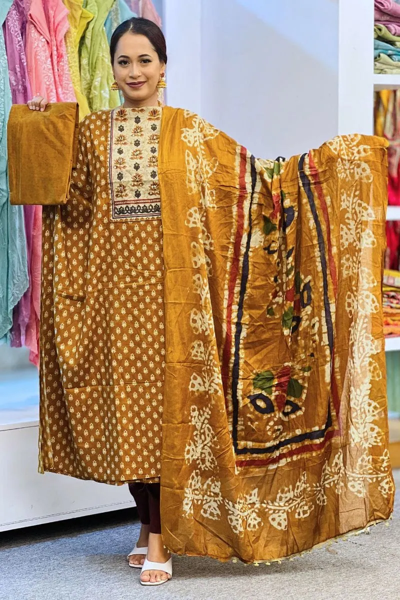 Elevate your ethnic style with this Mustard Yellow Cotton Joypuri Salwar Suit, featuring elegant Joypuri prints on soft, breathable cotton for a fresh and graceful look.