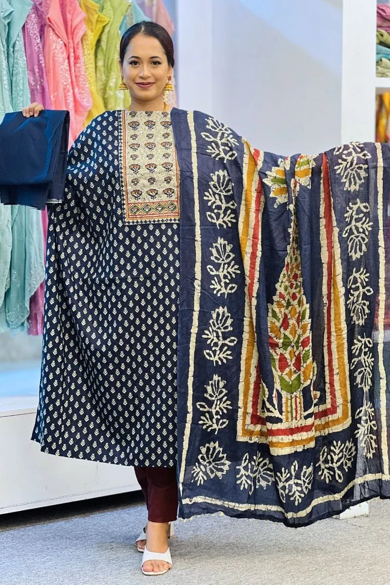 Enhance your ethnic elegance with this Navy Blue Cotton Joypuri Salwar Suit, featuring rich Joypuri prints on soft, breathable cotton for a graceful and timeless look.
