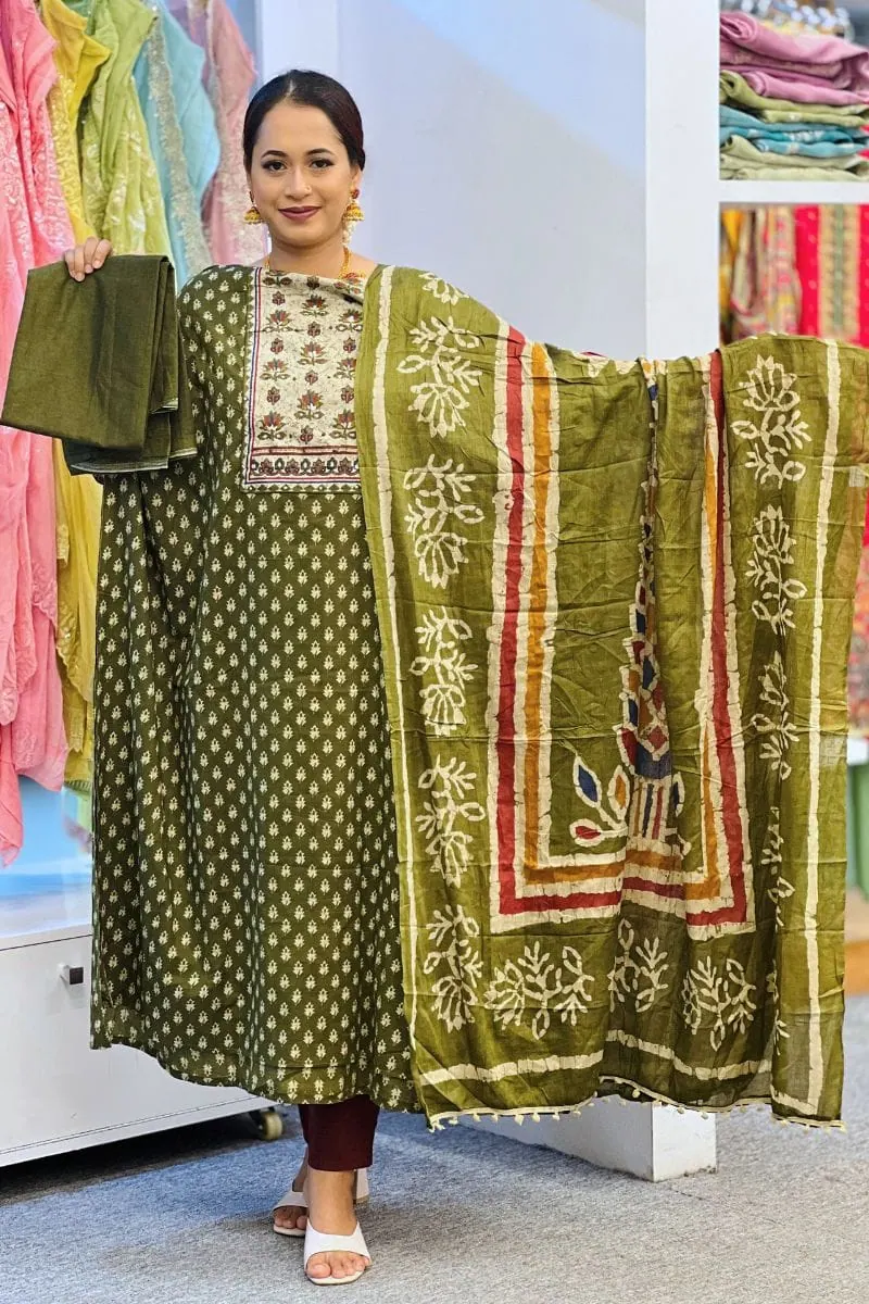 Refresh your ethnic collection with this Olive Green Cotton Joypuri Salwar Suit, designed with intricate Joypuri prints on soft, breathable cotton for an effortlessly elegant look.