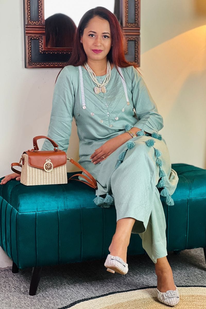 Stay effortlessly elegant with this Pesta Green Jacquard Cotton Co-Ords, featuring premium jacquard cotton fabric and a chic coordinated design for a fresh, modern look.