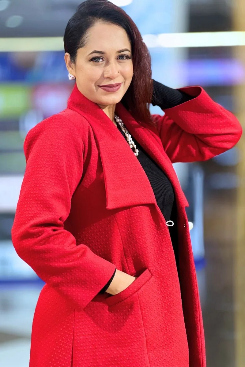 Elevate your style with this Red-Maroon Jacquard-Knit Short Coat, a perfect blend of comfort and sophistication. Crafted with premium knit fabric and intricate jacquard patterns, this coat adds warmth and elegance to any outfit, ideal for casual outings or festive occasions.
