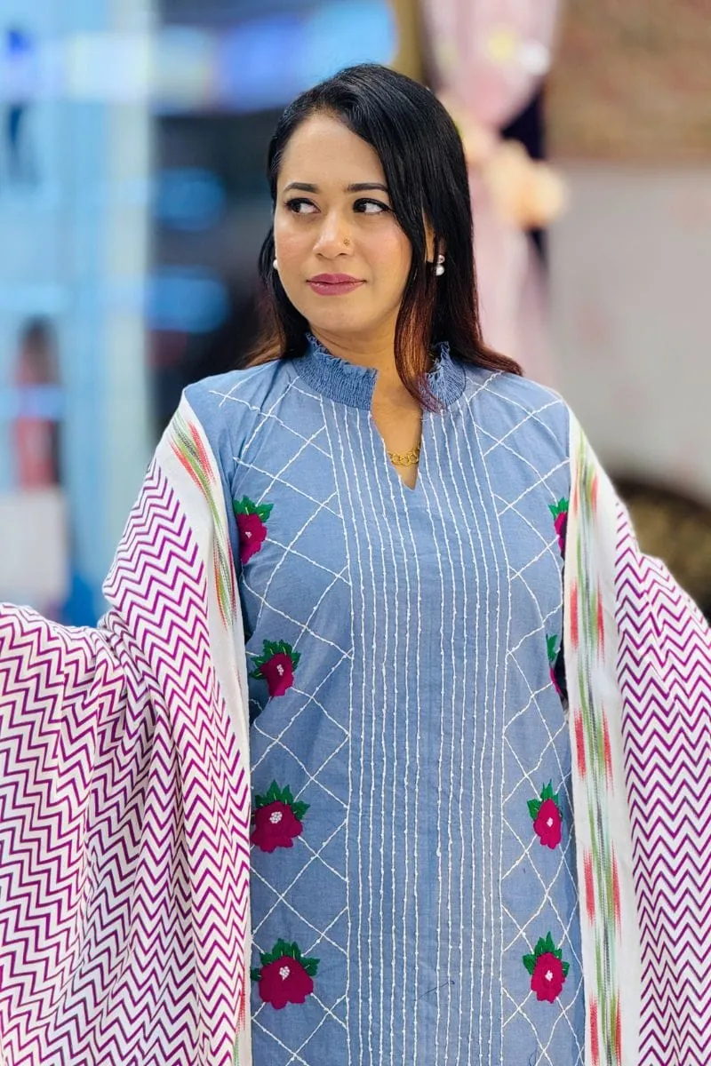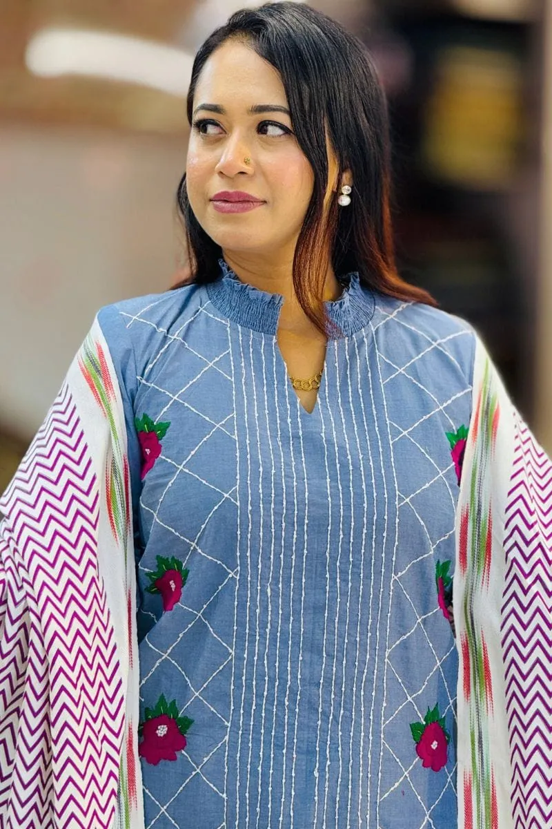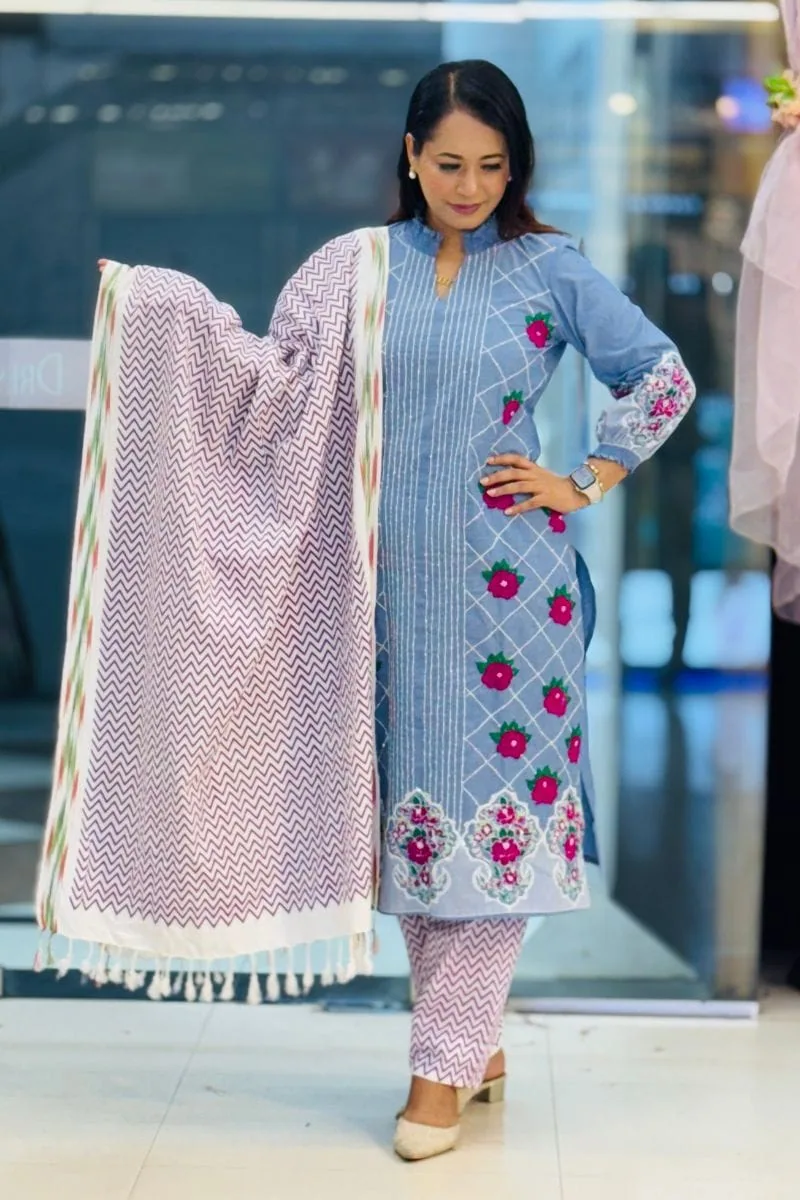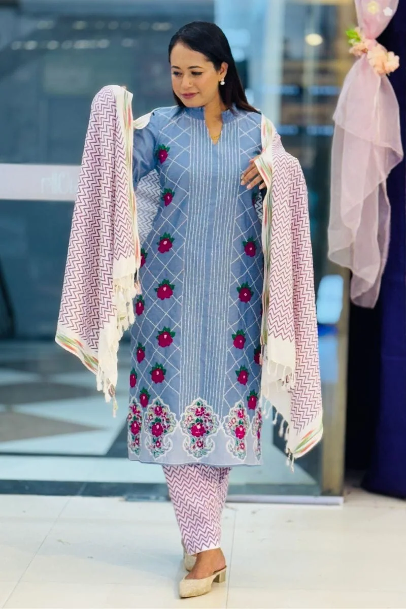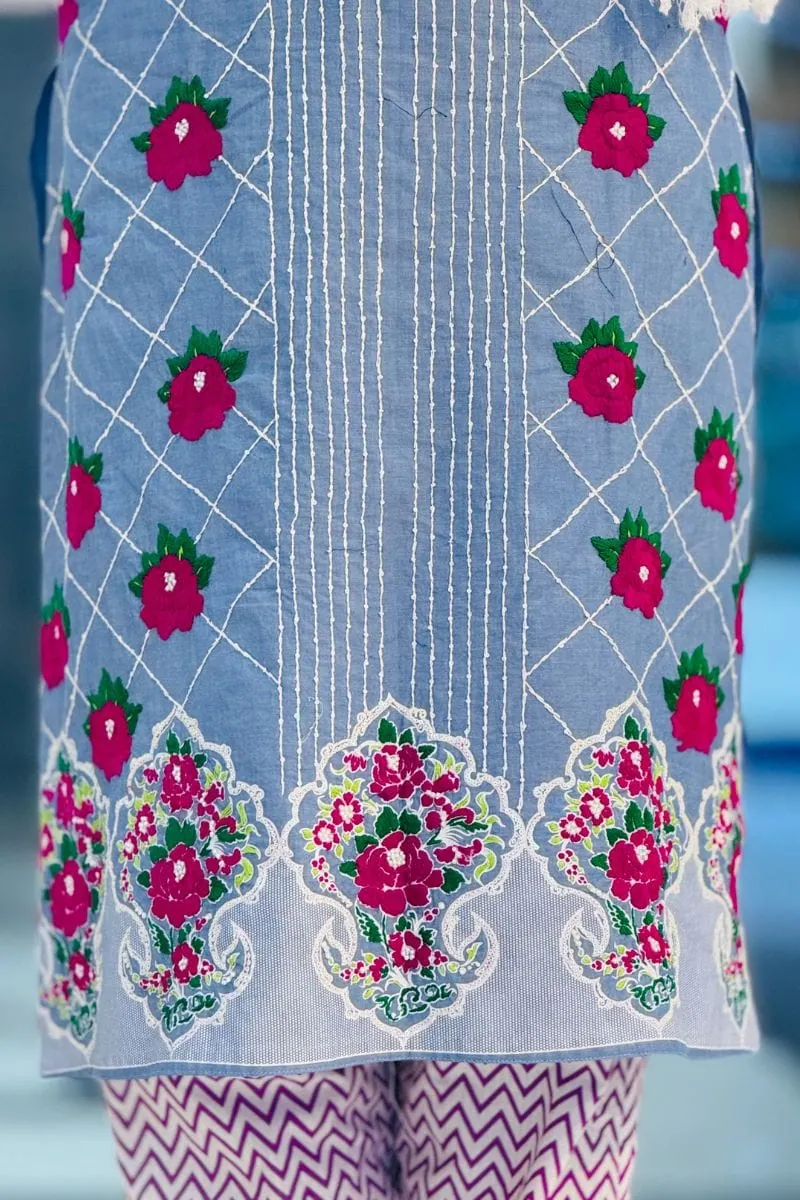 Riviera Blue Chambray Screen Printed with Embroidered Shalwar Suit