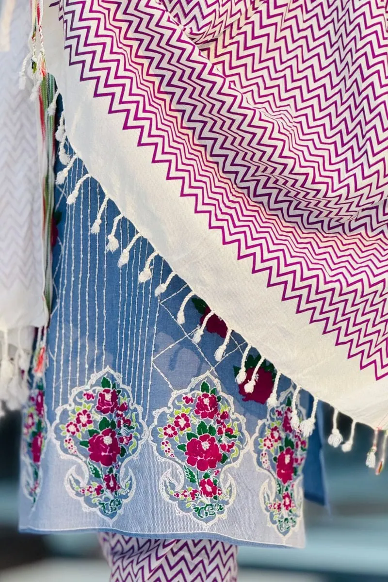 Experience the elegance of this Riviera Blue Chambray Shalwar Suit featuring exquisite screen printing and delicate embroidery. A perfect blend of contemporary style and traditional craftsmanship.