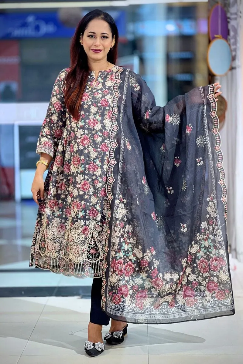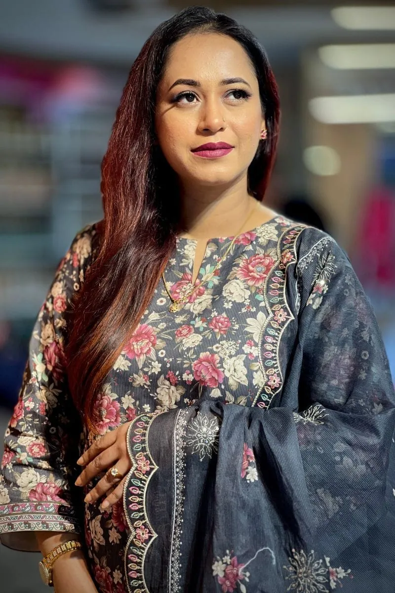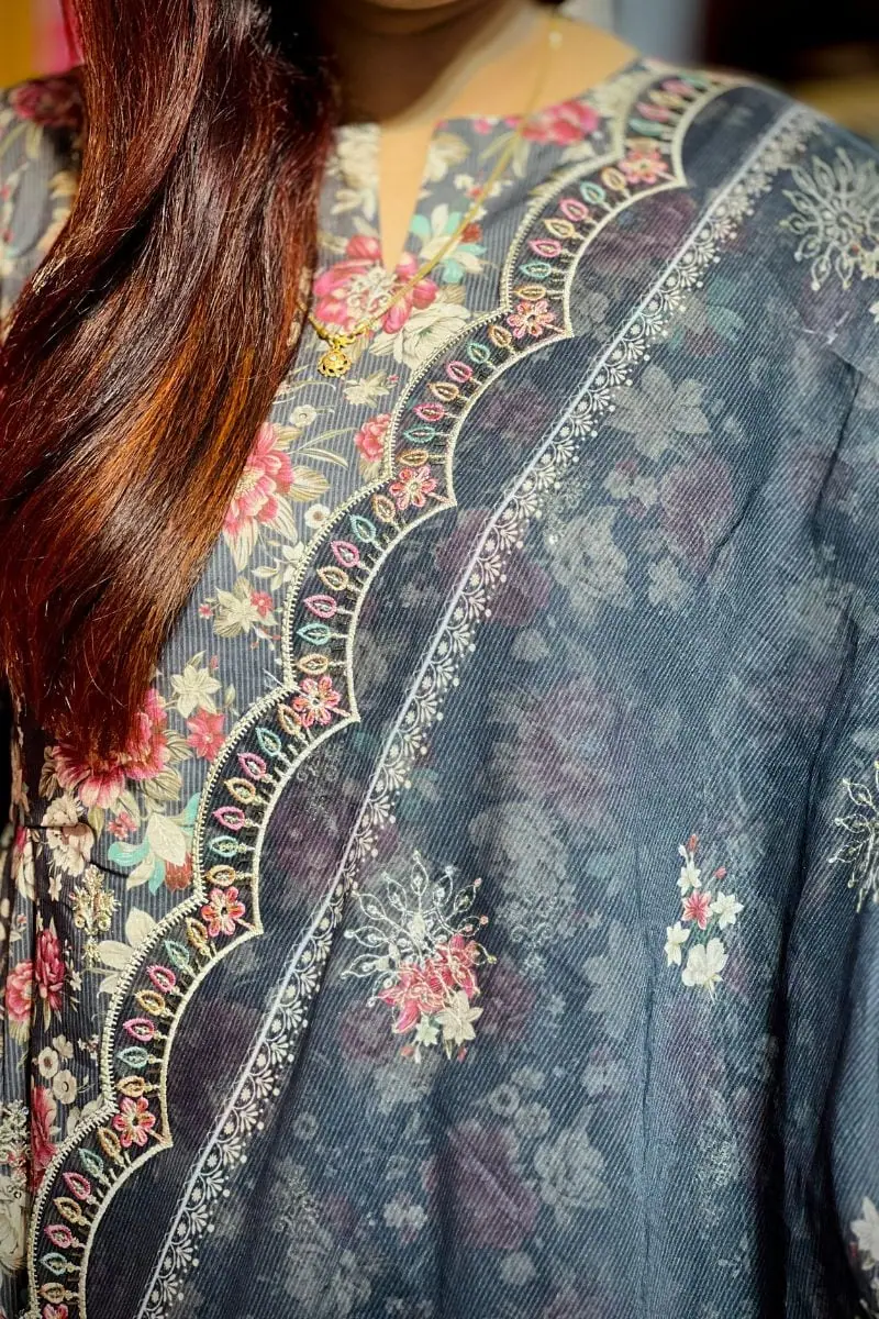 The suit features intricate machine embroidery enhanced with delicate sequins, adding a soft shimmer that elevates the overall look without being overpowering. Its graceful silhouette and comfortable fit make it suitable for festive gatherings, family occasions, office celebrations, and casual events.