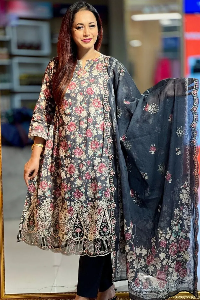 Blending traditional charm with modern detailing, this embroidered cotton shalwar suit pairs beautifully with minimal jewelry and classic footwear. A perfect choice for those seeking an elegant yet easy-to-wear ethnic outfit with a touch of sparkle.