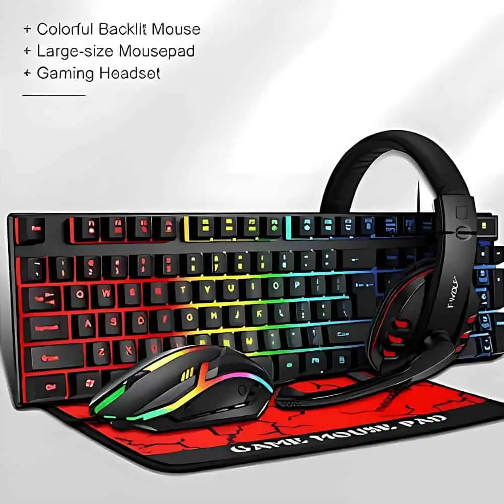 Level up your gaming setup with the T-WOLF TF800 4-in-1 Gaming Combo. This comprehensive bundle includes a mechanical keyboard, a gaming mouse, a comfortable headset, and a durable mouse pad, providing everything you need for immersive gaming sessions. Enjoy enhanced performance, precision control, and comfortable gameplay.
