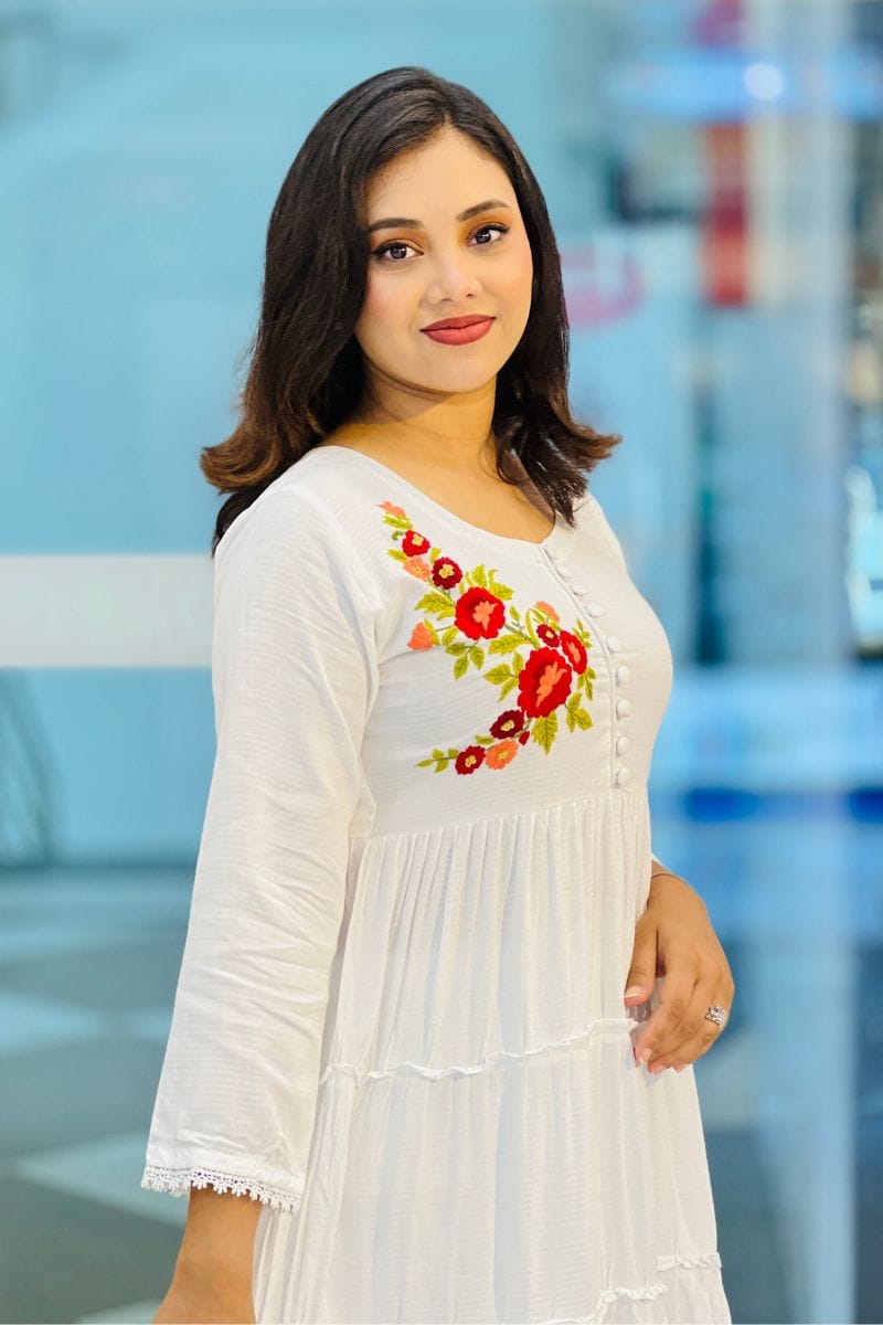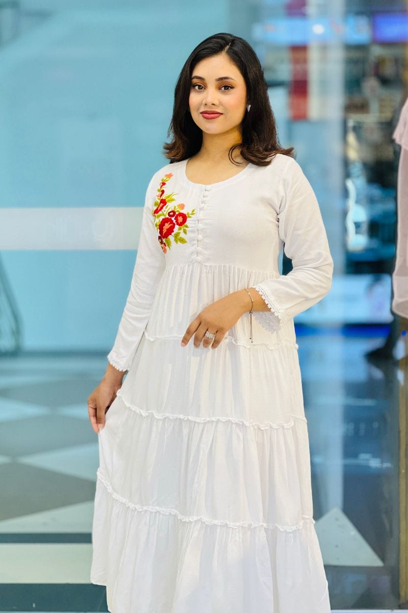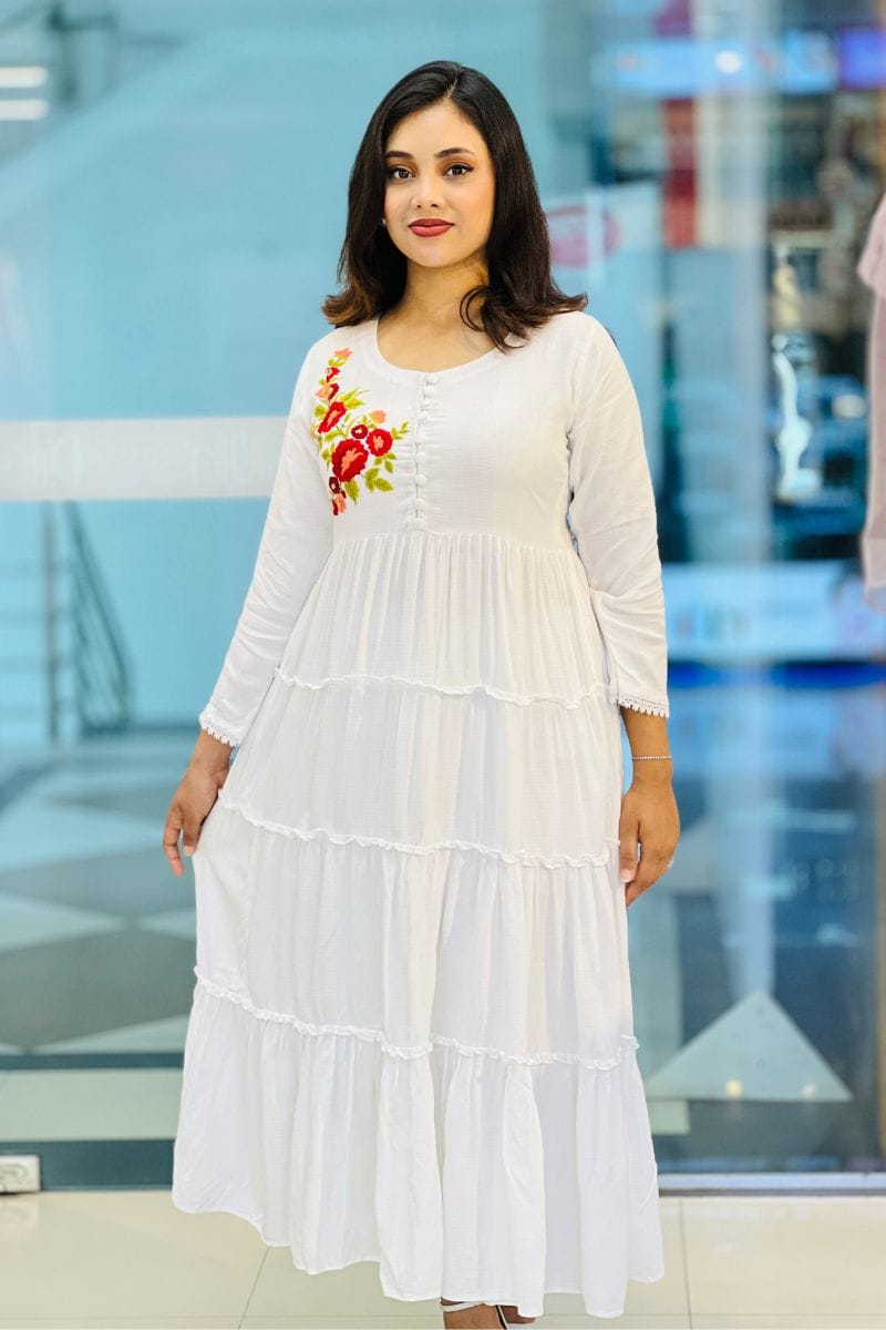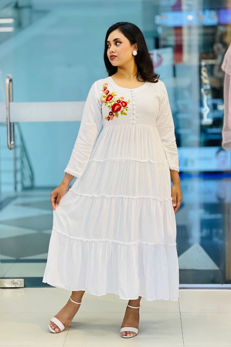 Elevate your elegance with our White Jacquard Rayon Silk Hand-Embroidered Gown. Crafted from premium fabric with exquisite hand embroidery, it’s perfect for formal events, ensuring you stand out with grace.